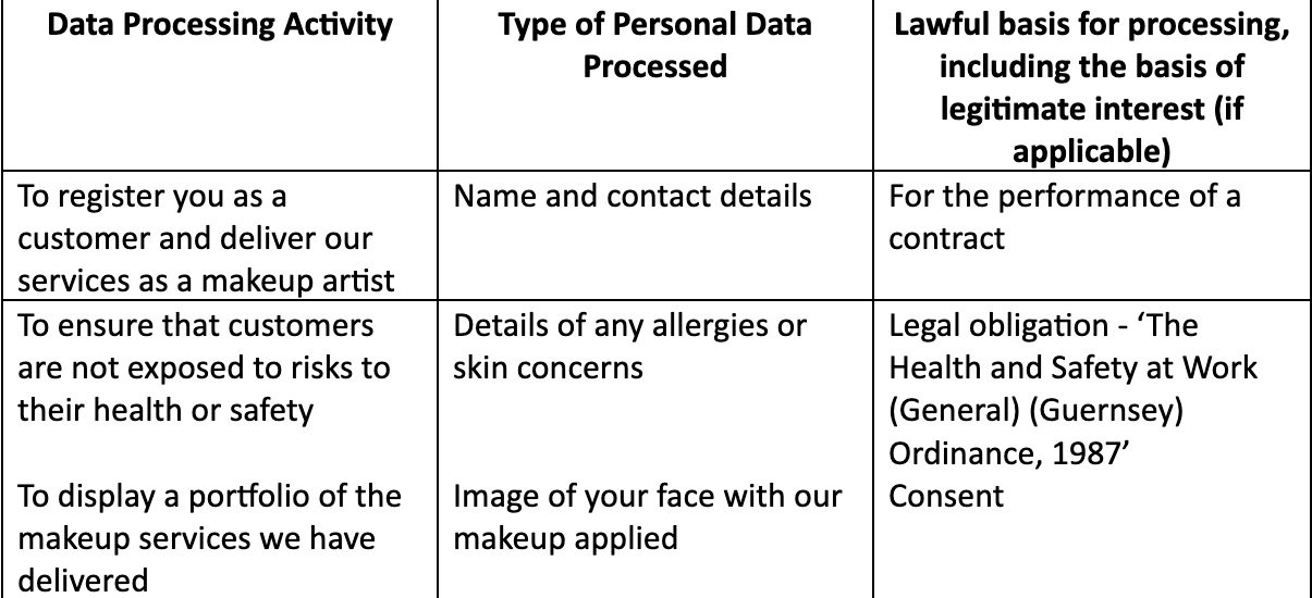 Under the Data Protection (Bailiwick of Guernsey) Law, 2017, the lawful bases we rely on for processing your personal data are detailed in the table below: